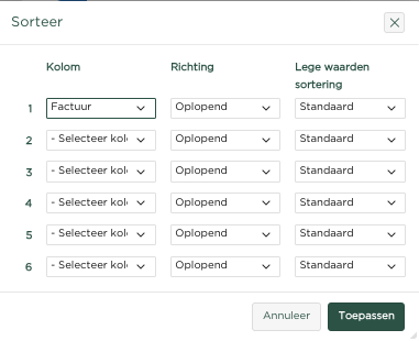 Kies hier een of meerdere kolommen om op te sorteren, de richting (Oplopend, Aflopend) en druk op