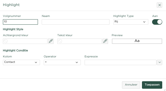 Kies hier de kolom, operator en expressie om een of meerdere rijen van een specifieke kleur te voorzien en druk op