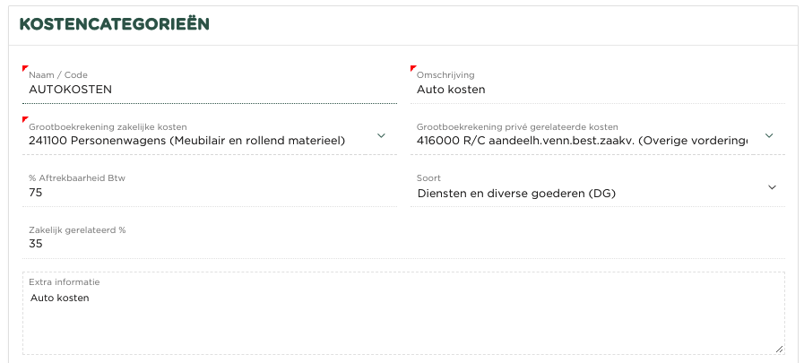 Voor iedere Kostencategorie kan worden vastgelegd, welk percentage er mag worden gehanteerd voor Inkomstenbelasting (boeking van beroepskosten en privé gerelateerde kosten binnen het grootboek) en voor de aftrekbaarheid van de Btw op bepaalde kosten.