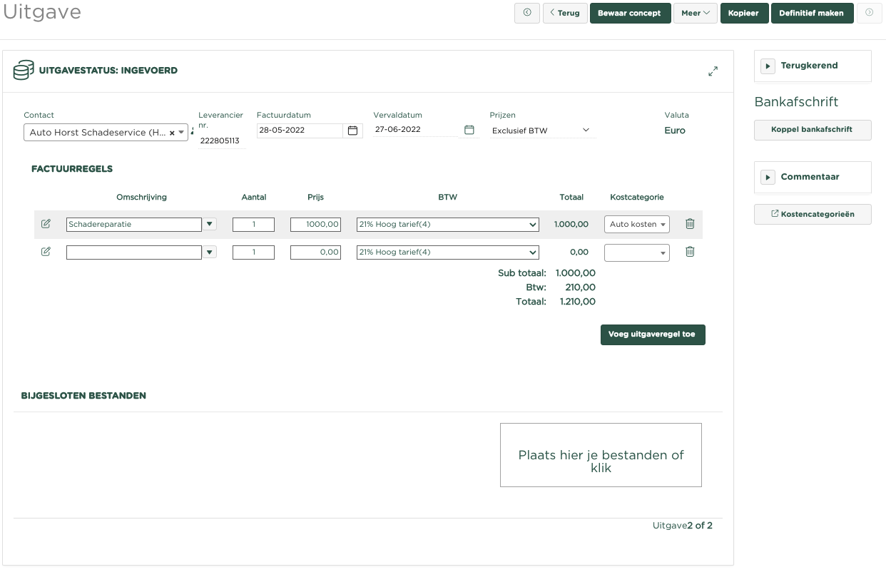Bij het invoeren van een Uitgave voor schadereparatie aan een personenwagen, wordt nu gekozen om deze te boeken op Kostencategorie 'Autokosten'. Nadat deze Uitgave 'Definitief' wordt gemaakt, zal deze worden geboekt binnen het grootboek en worden verwerkt binnen de Btw-aangifte.