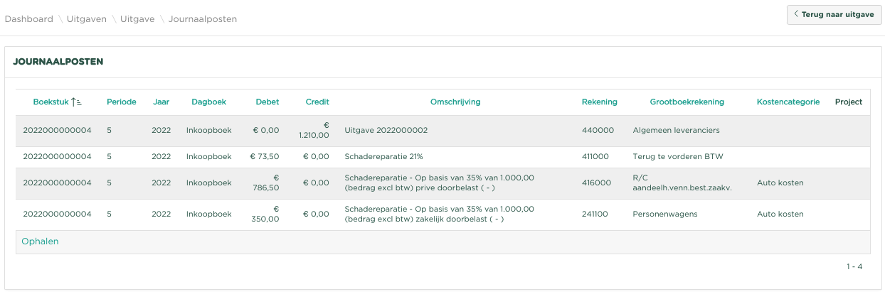 Als we vanuit de Uitgave kiezen voor 'Journaalposten' zien we de volgende boekingen: