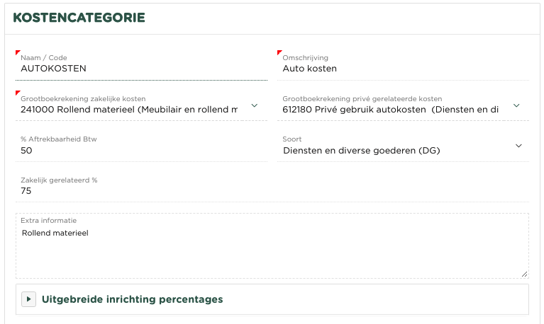 Geeft hier het percentage van de kosten welke zakelijk gerelateerd zijn, zoals in het getoonde voorbeeld 75% van de Autokosten als zakelijk gerelateerd worden gezien. In deze situatie zien we dus 25% als privé gerelateerd.